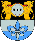 Vorderpranken haltend, unten von Silber und Blau geteilt, darin eine Lilie in